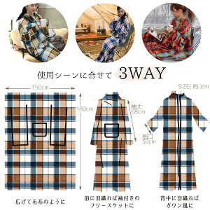 毛布としても、前から袖を通してフリースケットとしても、背中に羽織ってガウン風にしても使えます。