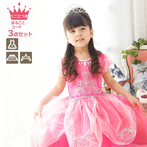 <まるごとコーデ3点セット デラックス ピンクプリンセス プリンセスドレスお洒落セット>【HLS_DU】【入門セット ビギナー向け ギフト プレゼント コスプレ ドレス プリンセス フリル 服 レース お姫様 サテン ロング 女の子 オーロラドレス 福袋】