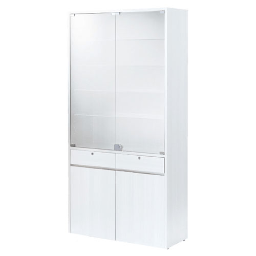 ●サイズ:W90×D35×H180cm●棚:透明ガラス5mm厚 内寸:収納部分上部W86×D31.5×H107cm下部W86×D31.5×H52cm(2段) 引き出しW37×D29×H7.5cm コード:2m●素材・加工:プリント紙化粧合板●重量:54kg●耐荷重:3kg/段●納期について:別送のため多少お時間がかかります。