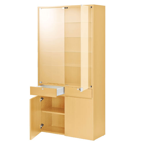 ●サイズ:W90×D35×H180cm●棚:透明ガラス5mm厚 内寸:収納部分上部W86×D31.5×H107cm下部W86×D31.5×H52cm(2段) 引き出しW37×D29×H7.5cm コード:2m●素材・加工:プリント紙化粧合板●重量:54kg●耐荷重:3kg/段●納期について:別送のため多少お時間がかかります。