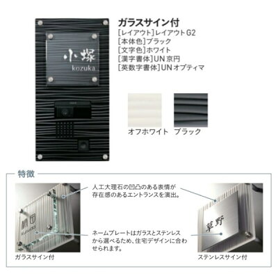 材質:人工大理石(アクリル系)、[ガラスサイン付]フロートガラス(文字部:掘り込み部分に塗装)、[ステンレスサイン付]ステンレス(文字部:掘り込み部分に塗装) 重量:ガラスサイン/0.8kg ステンレスサイン/0.7kg サイズ:イメージ参照 付属品:取付ボルト(直径4×長さ30mm)4本、六角ナット4個●納期目安は表札レイアウトご承認後平日のみカウントで14日前後です。