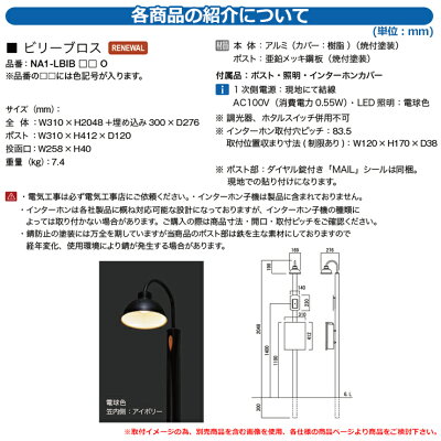 門柱 ポスト 機能門柱 ビリーブロス 付属品:ポスト・照明・インターホンカバー お椀のようなシェードが印象的な機能門柱ビリーブロス! 販売条件 ◆詳しくはこちらをご確認ください カラー ・GBグロスブラック ・CGチャコールグレー ・WHホワイト ・DBダークブラウン ・REレッド ・DLダルブルー サイズ ※サイズ仕様は詳細をご確認下さい 材質 ※材質仕様は詳細をご確認下さい 仕様 ※別途仕様詳細をご確認下さい セット内容 ■ビリーブロス 付属品:ポスト・照明・インターホンカバー 品番:NA1-LBIB□ ※品番の□にはカラー品番が入ります。