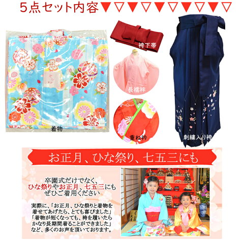◆素材 ポリエステル等 ◆カラー 赤 水色 ピンク ◆内容 着物(四つ身)・重ね衿・長襦袢・袴(行燈・スカートタイプ)・袴下帯 ◆注意 ・システム上カート内で追加購入商品の金額が反映されません。