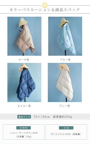 多機能ミニダウンケットのご紹介 サイズ 70×130cm 詰め物 シルバーダックダウン80% 詰め物重量:90g 生地 ポリエステル100% 製法 スナップ/紐2本付/ポケット2ヶ所/2本針縫製 洗濯可否 ご家庭で丸洗いOK 匂いについて 適切な洗浄を実施した羽毛を使用しておりますが、動物由来の素材である羽毛は完全に無臭にはなりません。