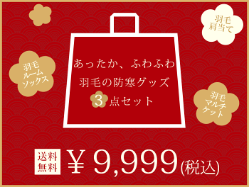 中身1点目:羽毛肩あて 商品サイズ 肩巾67cm×前丈35cm×後ろ丈49cm 詰め物 ダックダウン80% スモールフェザー20% 側生地 ポリエステル100% 中身2点目:羽毛ルームシューズ 商品サイズ 肩横12×奥行29×高23cm(対応サイズ:22~27cm男女兼用) 詰め物 ダックダウン80% スモールフェザー20% 側生地 ポリエステル100% 中身3点目:羽毛マルチケット 商品サイズ 70×130cm 詰め物 ダックダウン80% スモールフェザー20% 側生地 ポリエステル100% ご確認ください ●こだわった洗浄工程により匂いの除去処理を行っておりますが、羽毛は天然素材ですので、完全に無臭ではございません。