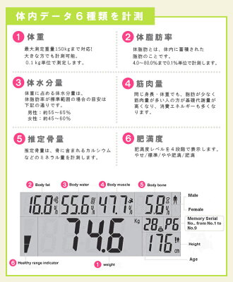 【商品詳細】 測定機能: 体重 / 体脂肪率 / 体水分量 / 推定骨量 / 筋肉量 / 肥満度 機能:自動電源ON、オートオフ機能 測定表示単位:100g単位 最大測定重量:150kg 体脂肪率計測:4.0〜80.0%(0.1%単位) 肥満度レベル:4段階 やせ/標準/やや肥満/肥満 メモリー:10人分まで登録可能 性別:男性 / 女性 身長:100cm〜240cm(1cm単位) 年齢:10〜80歳 電源:リチウム電池(CR2032)×1個 (別売) サイズ:300×260×22mm 重量:1.4kg 材質:強化ガラス、ABS樹脂 カラー:ブラック ※ペースメーカーなど、医療用電気機器をつけている方は絶対に使用しないで下さい。