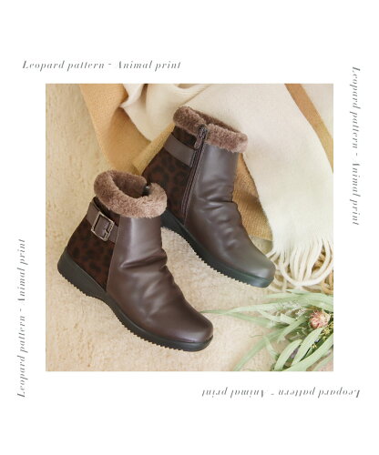 機能性満載なショートブーツ! やわらかく上質なスムースとヒョウ柄スエードのコンビ使いで、上品さを備えたショートブーツ。