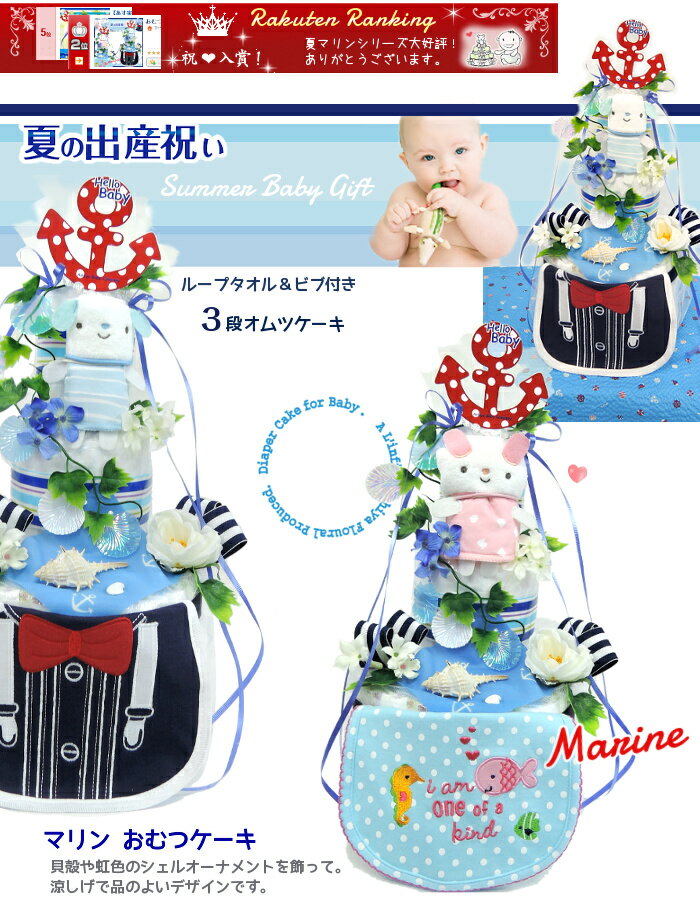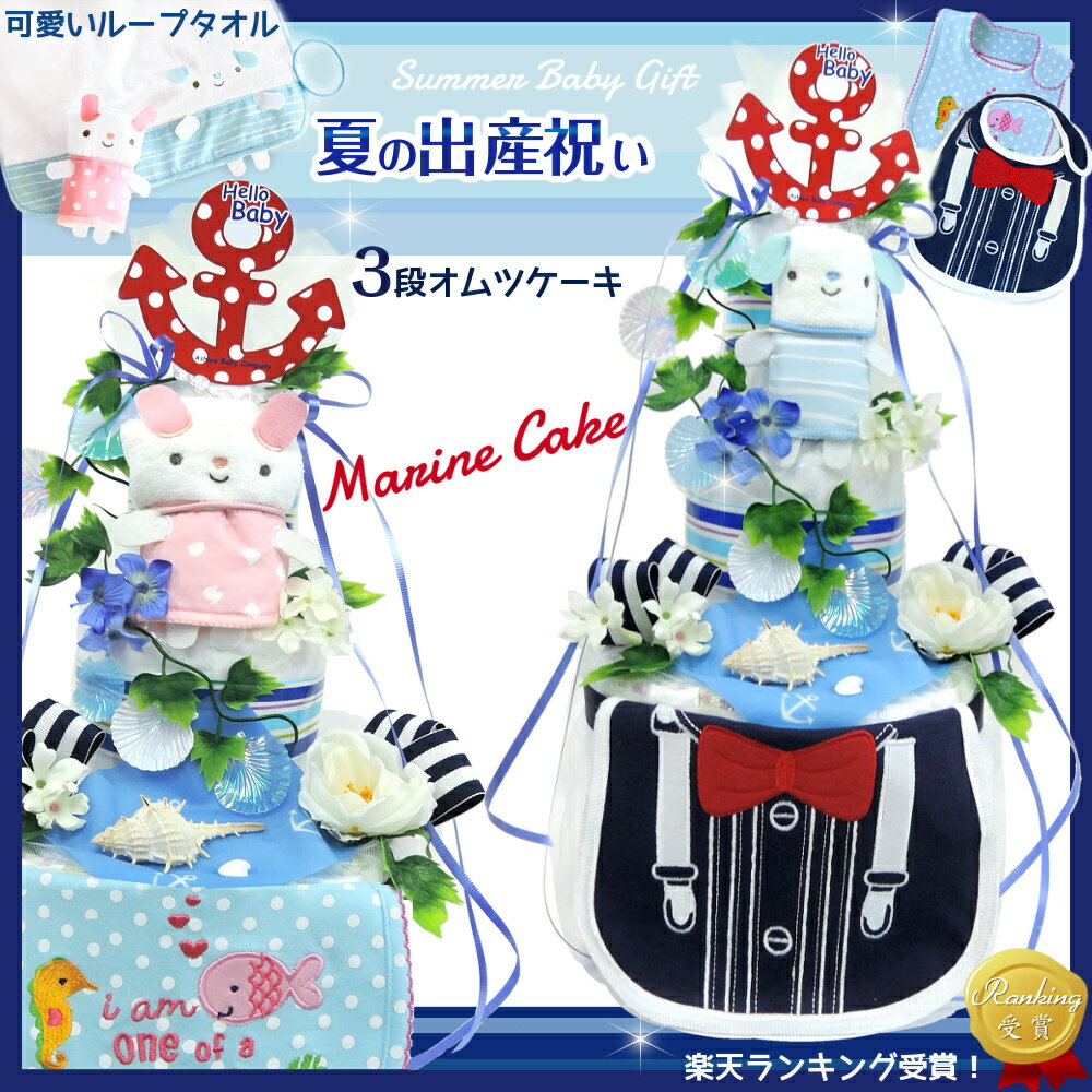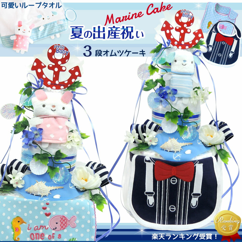 おむつケーキ3段 ブルーマリン【夏の夜の夢】お洒落なクールボーイビブ 夏のご出産祝い★ 保育園でも活躍のループタオル♪ウサギ,ワンコ 送料無料[カーターズ スタイ]オムツケーキ【出産祝 ディズニー SMTB】あす楽対応