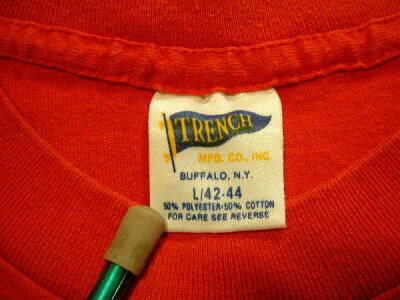 '88製 TRENCH 半袖プリントTシャツ MADE IN USA カラー レッド サイズ表記 表記はLサイズです (詳しくは実寸をご覧下さい) 素材表示 ポリエステル50% コットン50% ヨゴレ 特にありません ヤブレ 擦れ感少々ありだまがみられますが問題なく着用いただけます 使用感 多少あります コメント アメリカ古着 '88製 TRENCH 減少傾向にあるUSA製 古着らしい良い味がでています。